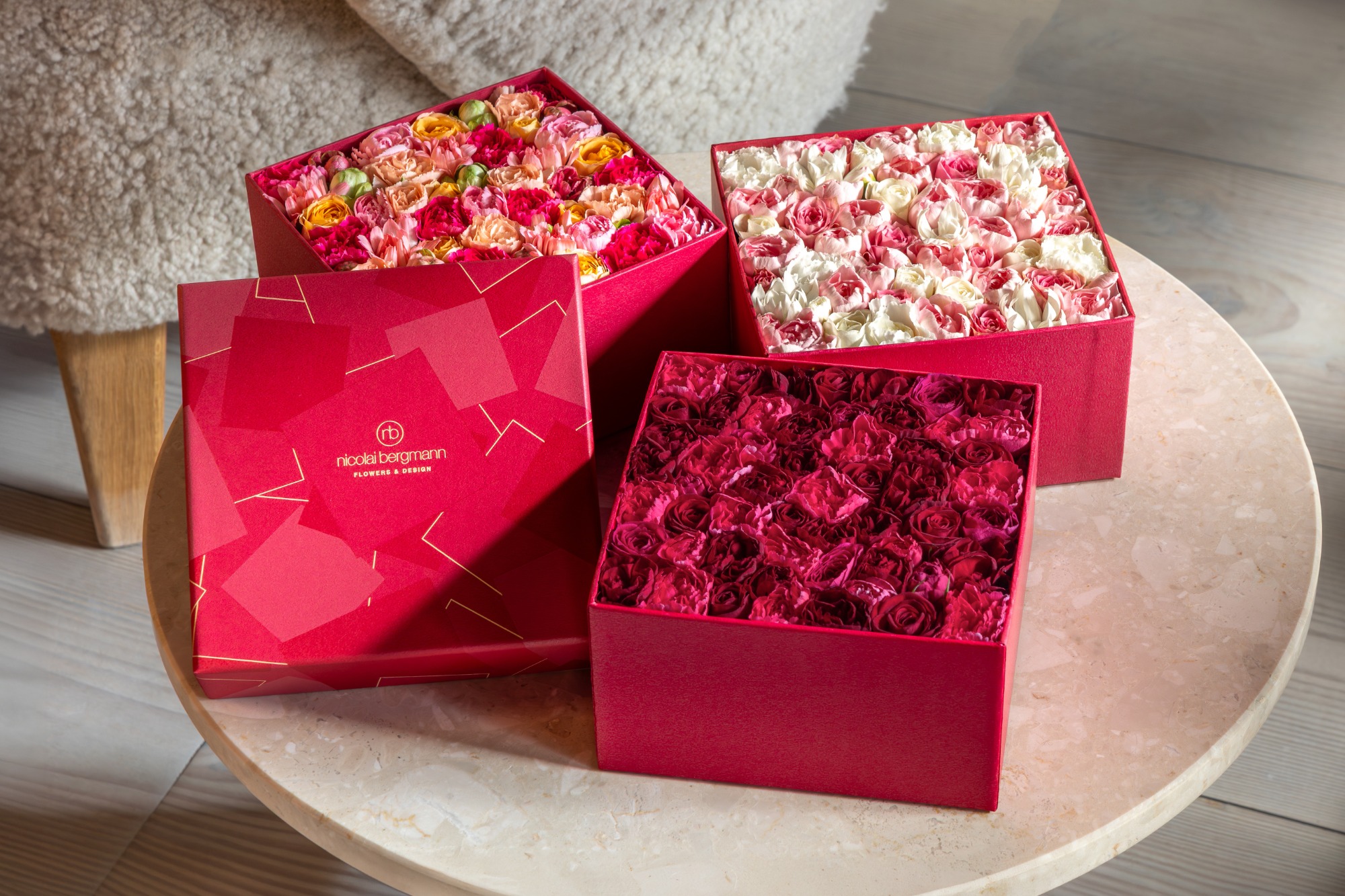 赤をベースに、ローズやカーネーション、マムが美しく調和したフレッシュフラワーボックス。華やかさの中に落ち着きと温かみを感じられる、ニコライ バーグマンならではのフラワーデザインに仕上げました。どんなシーンにも馴染むような愛らしいデザインが特徴です。