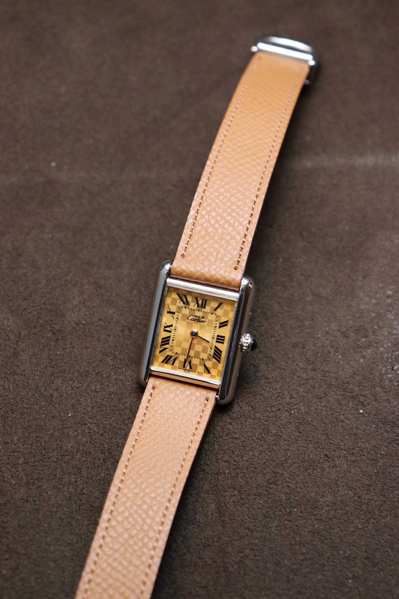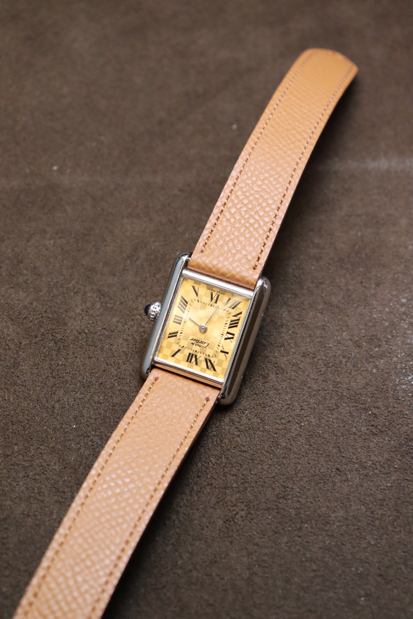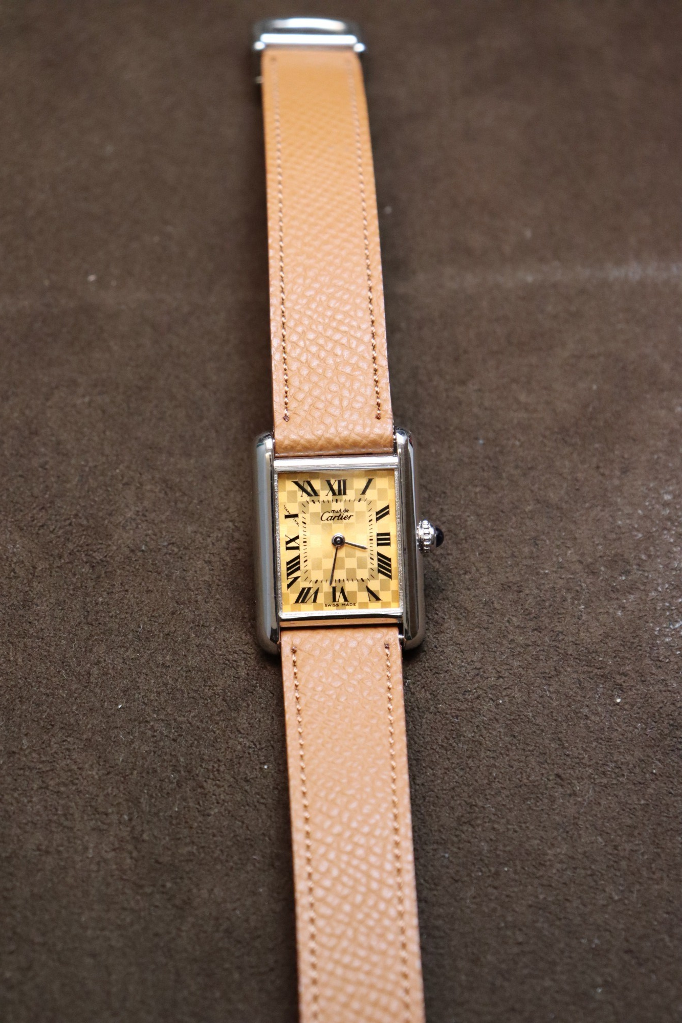 「持たなければならないタンク」という意味を冠した「マスト タンク」コレクション。「Ref.W1017654」は2003年のクリスマス限定として登場したリファレンスで、約29.5×約22mm径のシルバー925製スモールケースに、チェック柄のオレンジダイヤルを組み合わせたタイムピースとなっております。