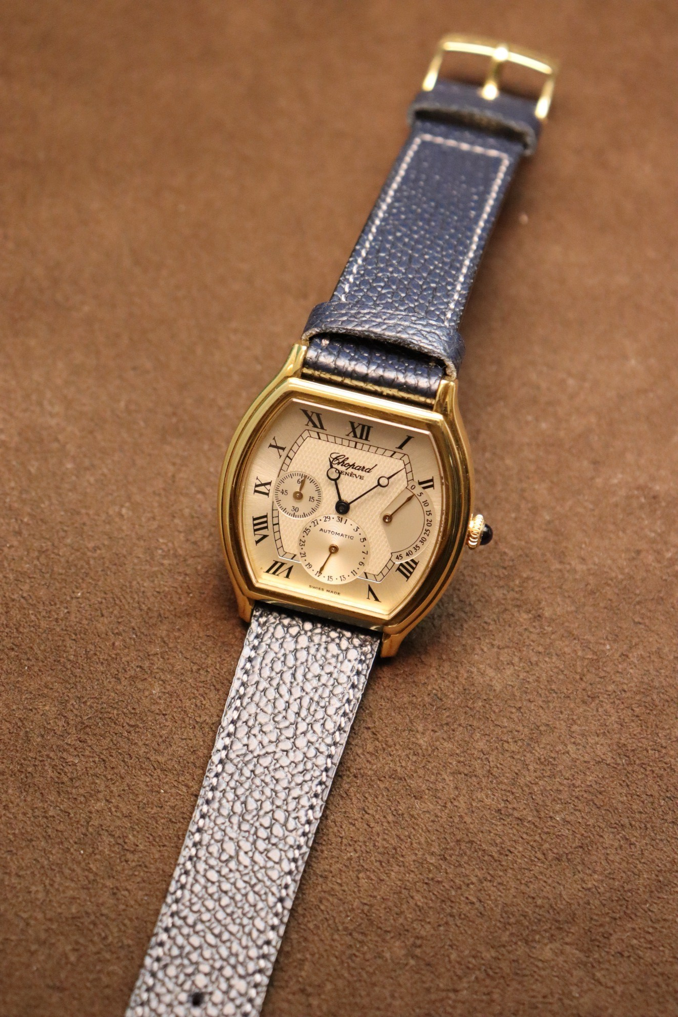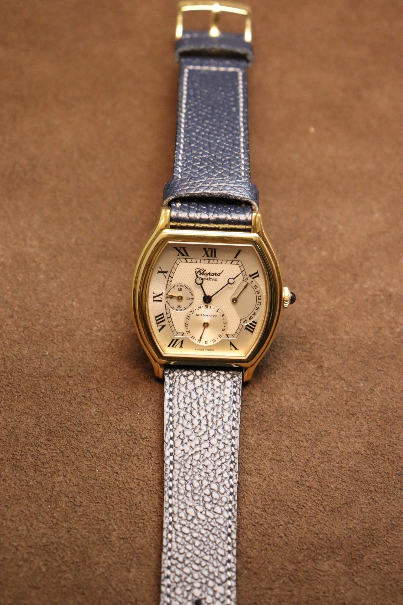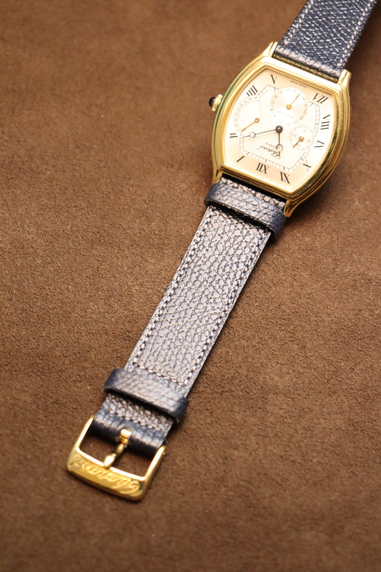 トノーケースにスモールセコンド、ポインターデイト、パワーリザーブの表示を備えた当モデル。時分はブルーのブレゲ針、インダイヤルはゴールドの針と使い分けており、細かなディティールが魅力的です。上品なデザインと、程よいサイズ感で、様々なシーンで活躍してくれるタイムピースです。当店オーバーホール済み。