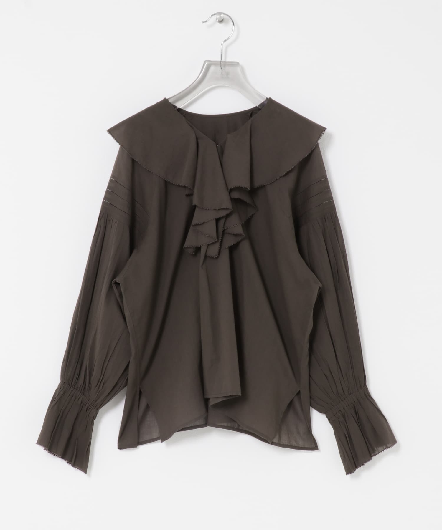 一枚で着映えする華やかなフリル衿が魅力の、コットンボイルラッフルブラウス。