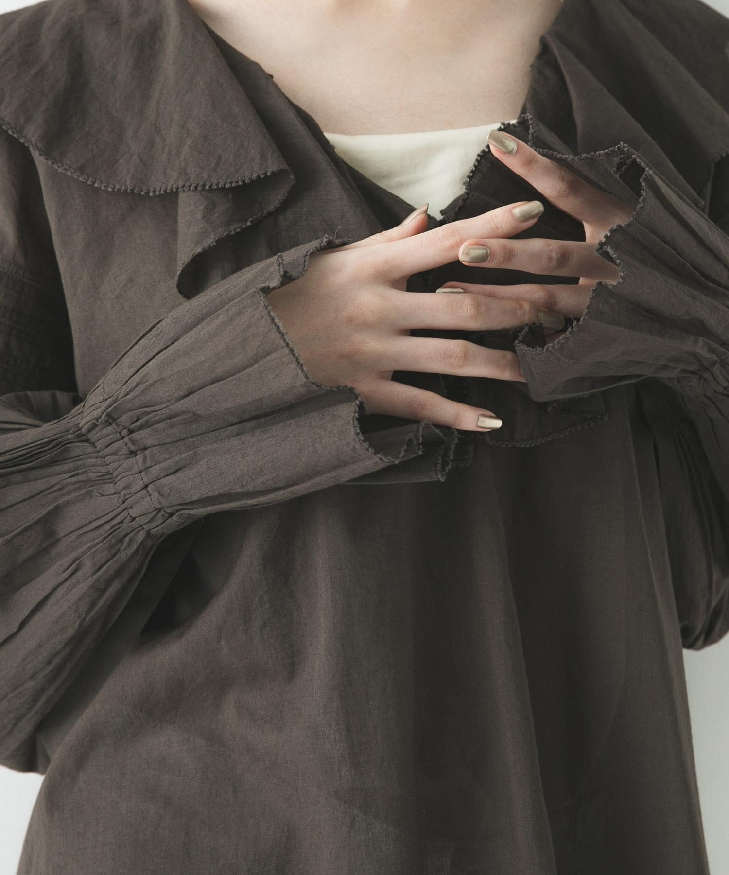 袖に施された繊細なレース刺繍や、袖口のフリル付きゴムギャザーなど、細部までこだわりが詰まった一着です。