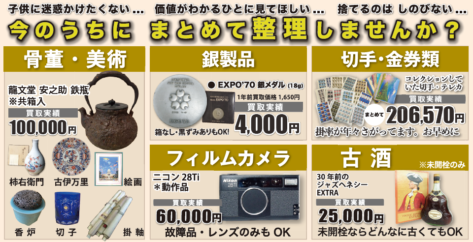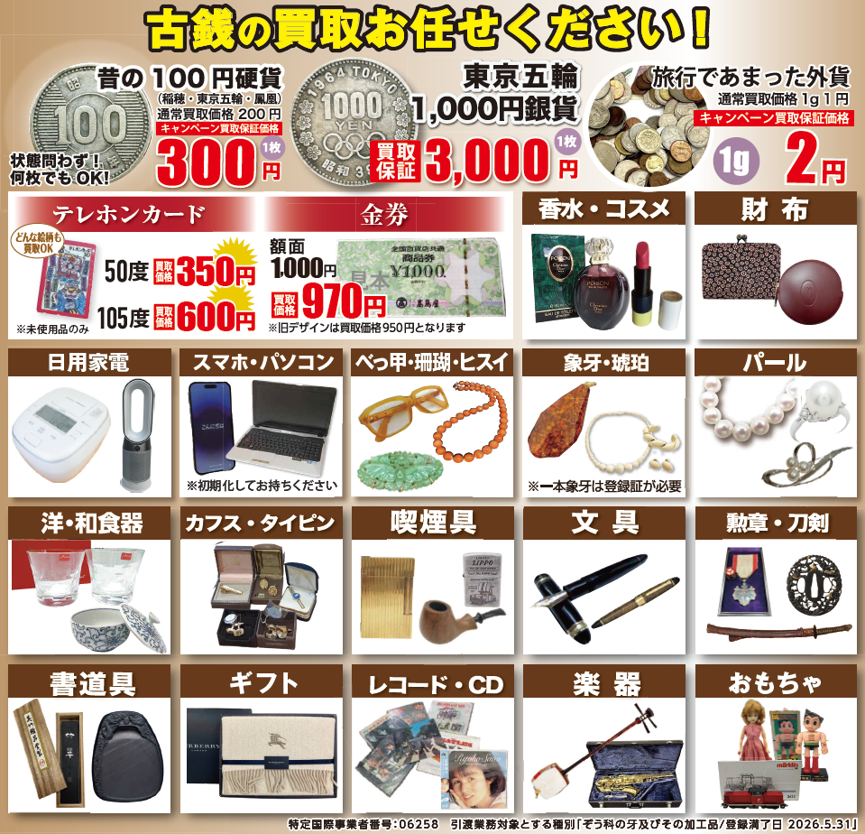 古銭、記念硬貨、商品券、骨董品、お酒、香水など幅広く査定しております♪