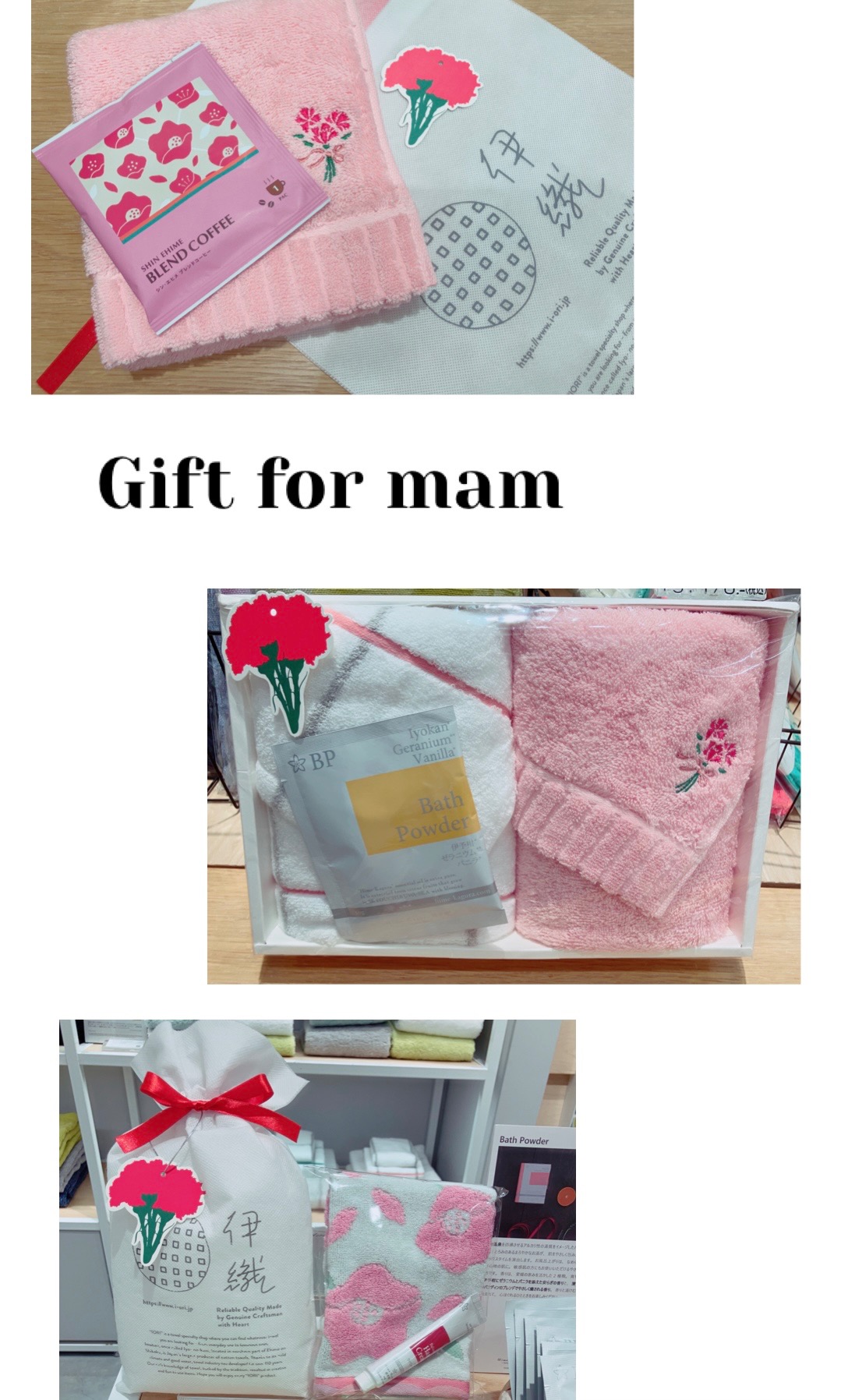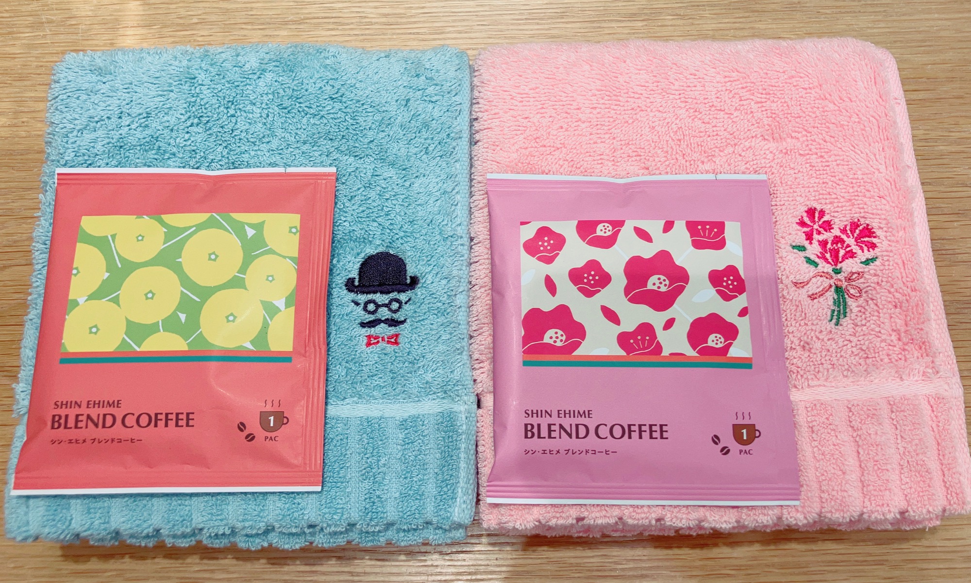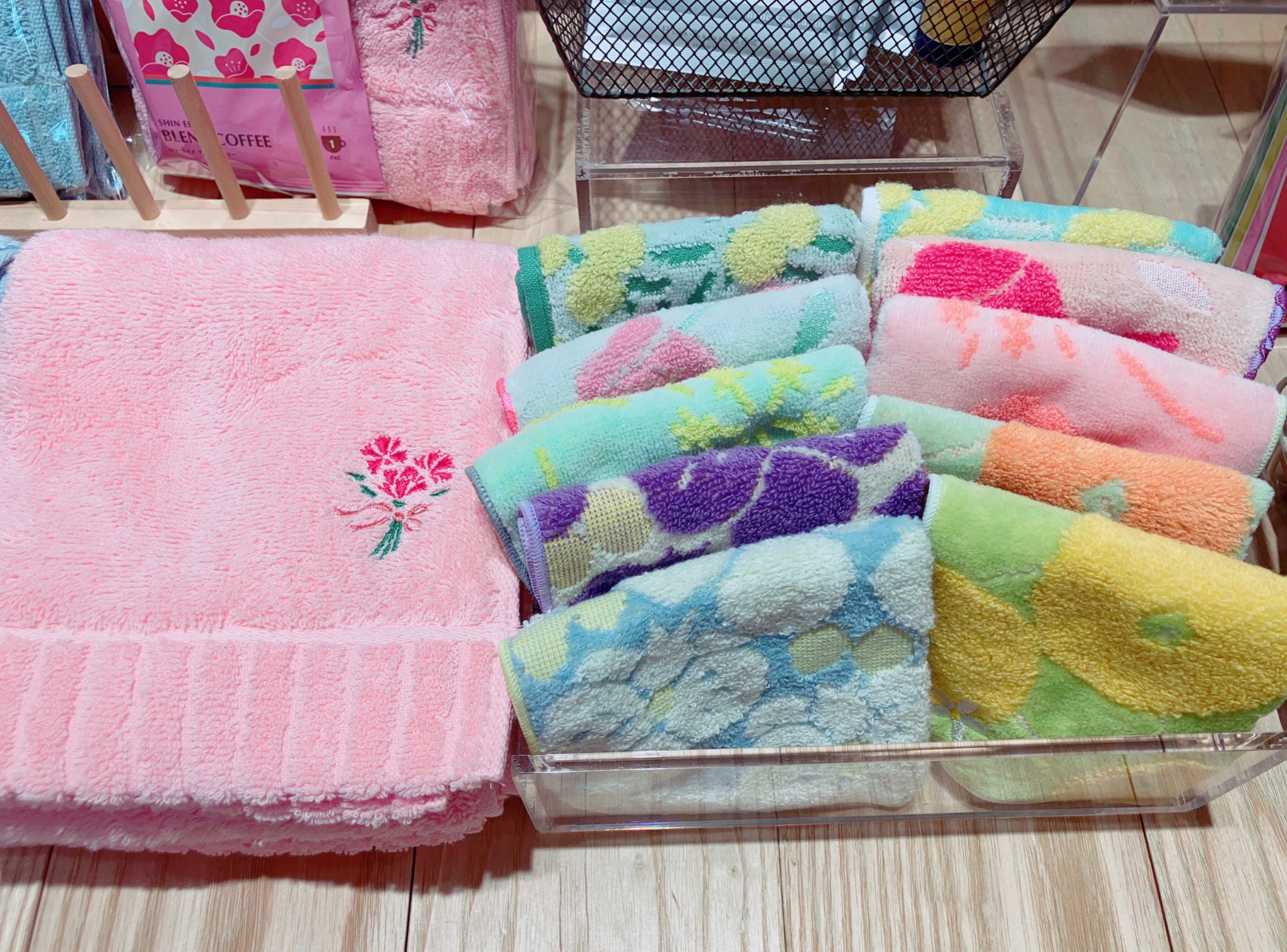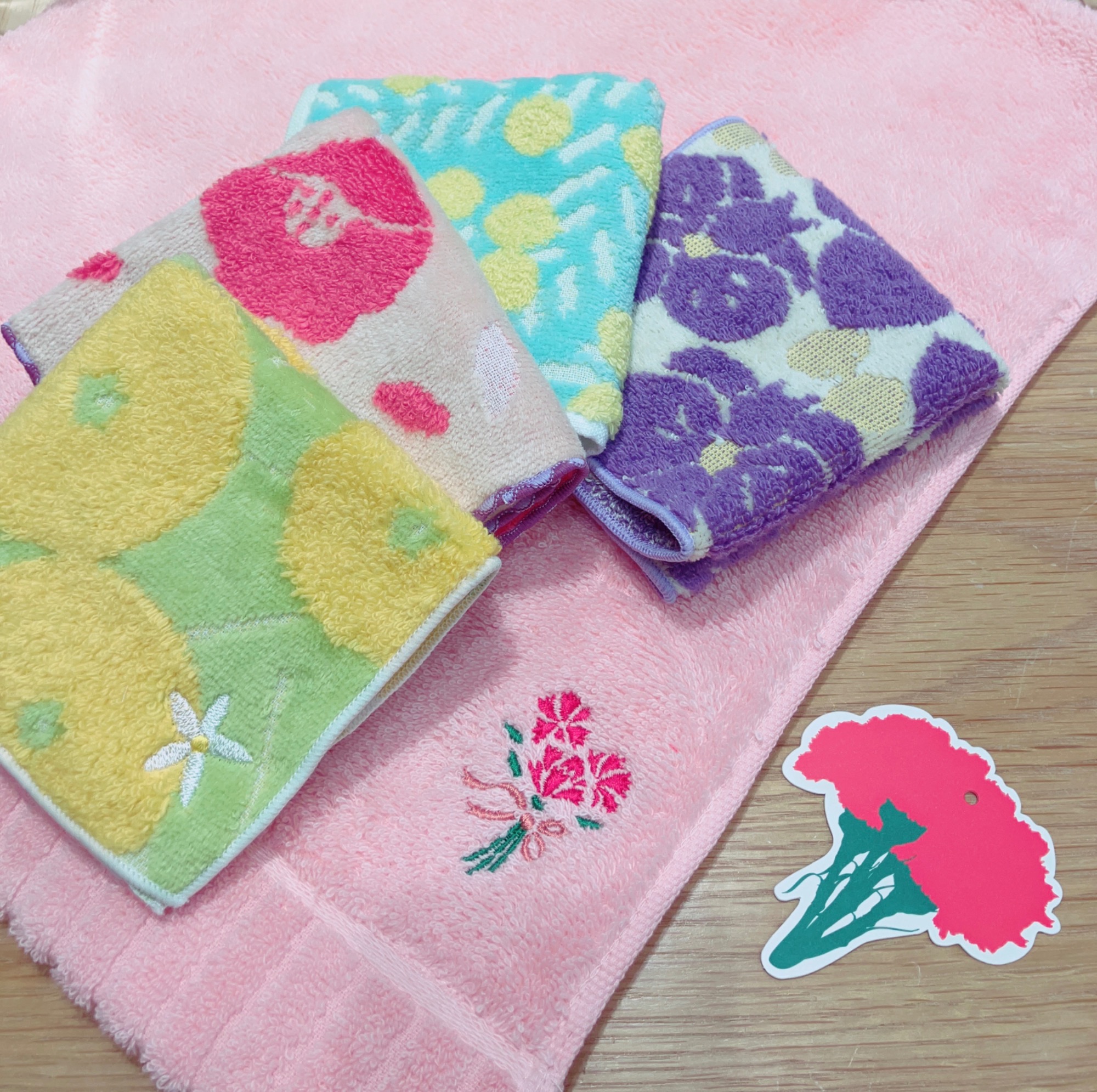 カーネーション刺繍タオルと、綺麗柄のタオルハンカチを組み合わせるのがおすすめ♪