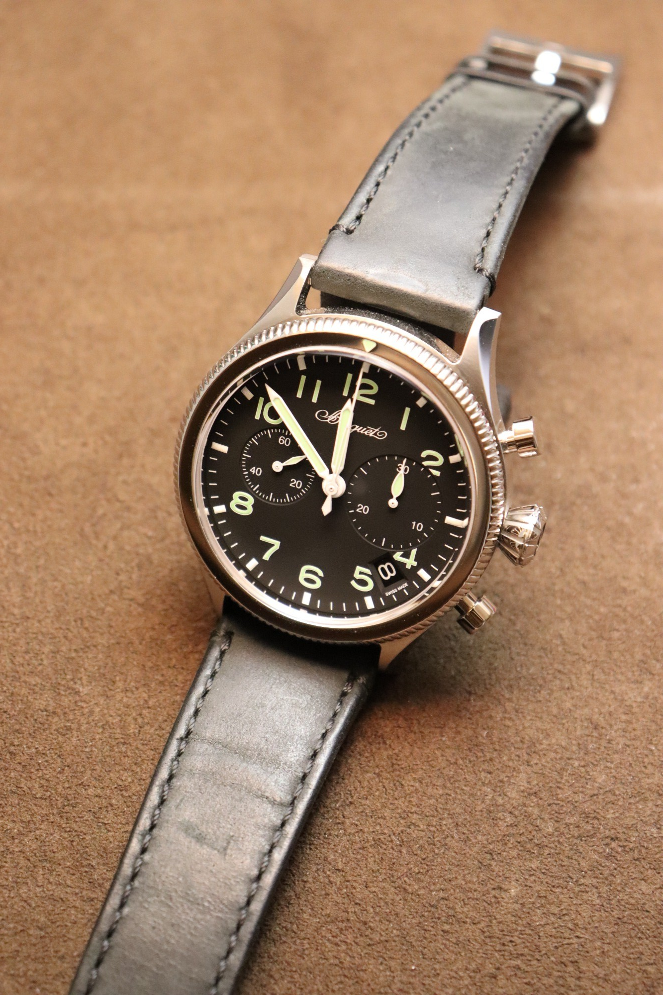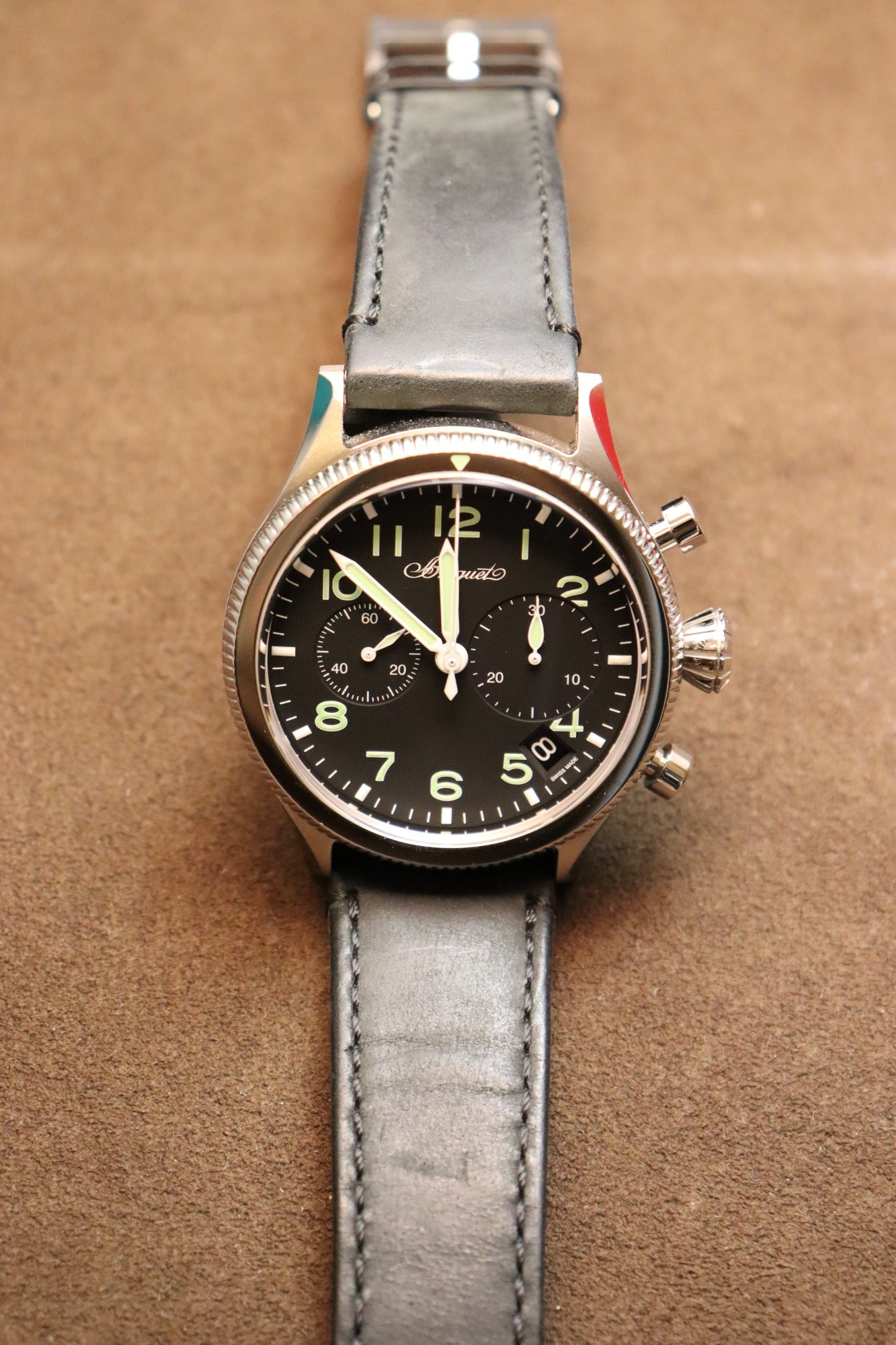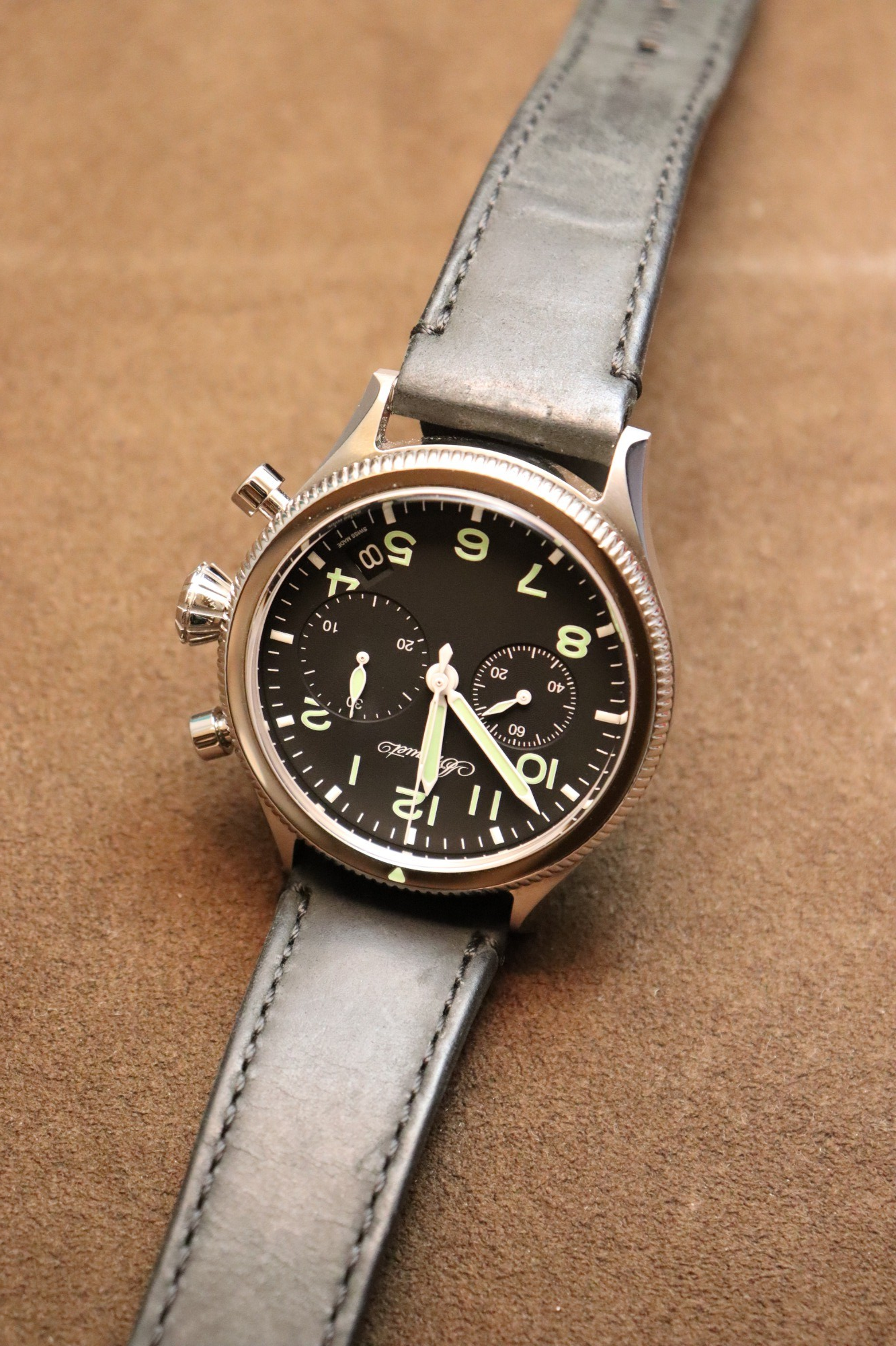 1950年代にフランスの海軍航空部隊(アエロナバル)の為にブレゲが製作した「タイプXX」を1995年に復刻した名作「Ref.3800」。その後継モデルとして、2023年に軍用デザインの「Ref.2057」と民間用デザインの「Ref.2067」の2種類が登場しました。こちらの「Ref.2057」は1955年~1959年にフランス空軍に1100本納入されたモデルから着想を得ており、モデル名にはアラビア数字の「20」が用いられています。フライバック機構搭載のキャリバー「7281」搭載、約60時間パワーリザーブ。