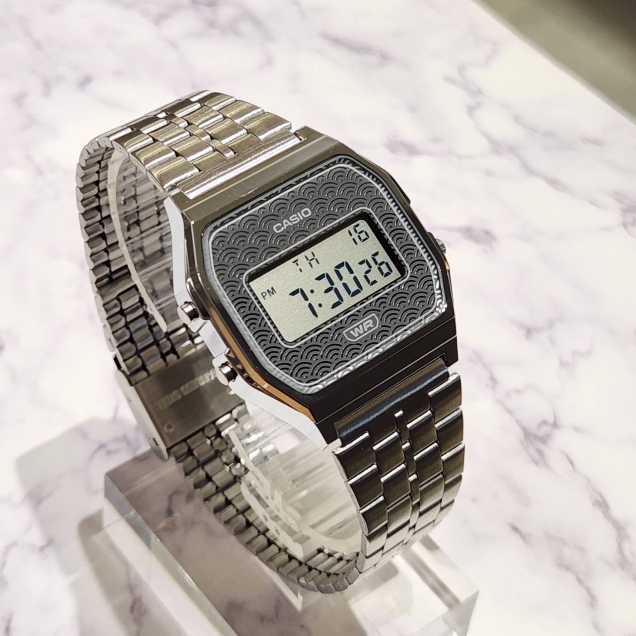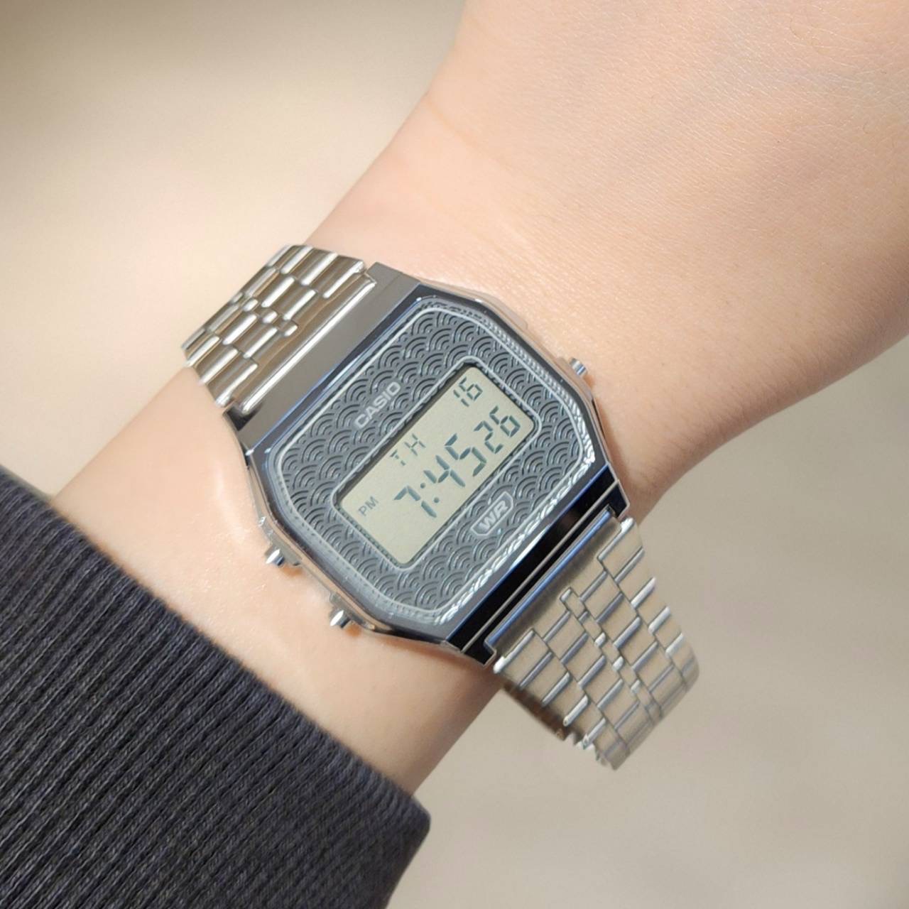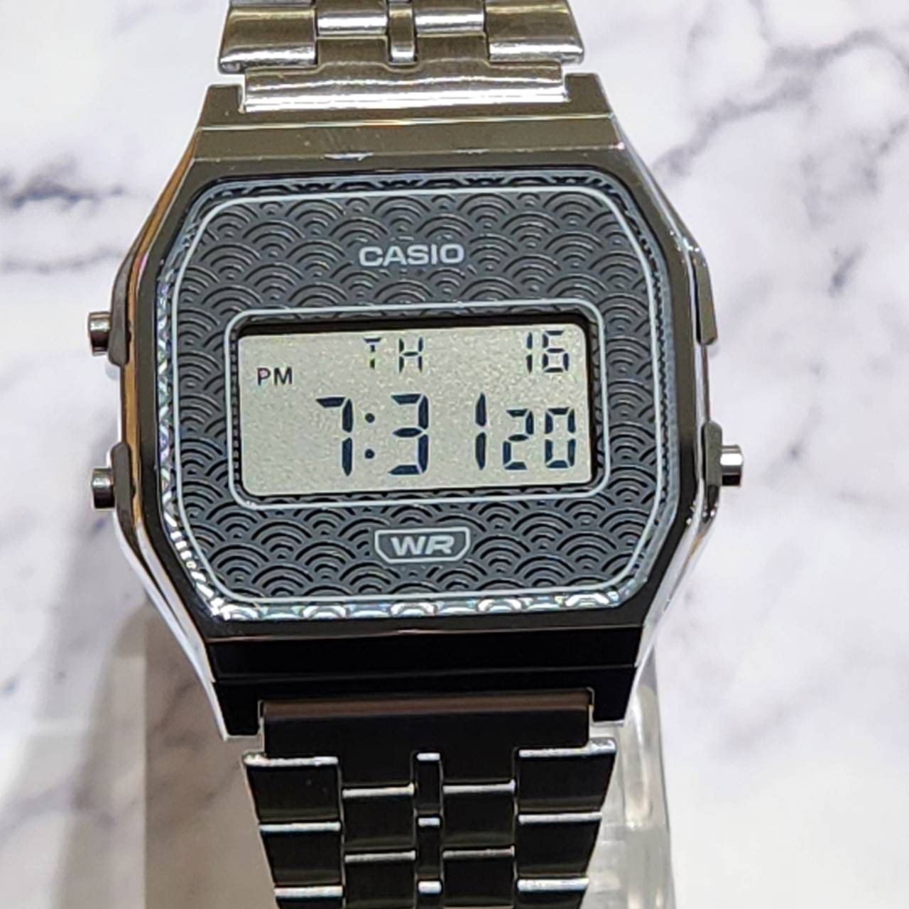 山形カシオで製造された日本製のA159をベースに、フェイスに伝統的な吉祥柄の青海波(せいがいは)があしらわれたモデル。