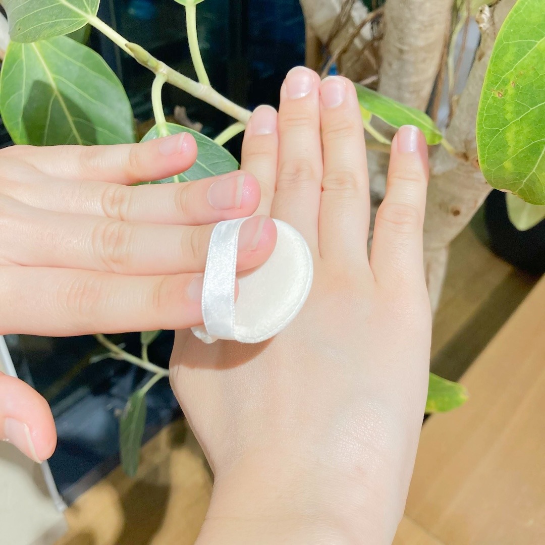 付属のパフはもちもちとして密度が高く、肌にのせると細かい粒子がなじみ、さらさらとした使い心地です。