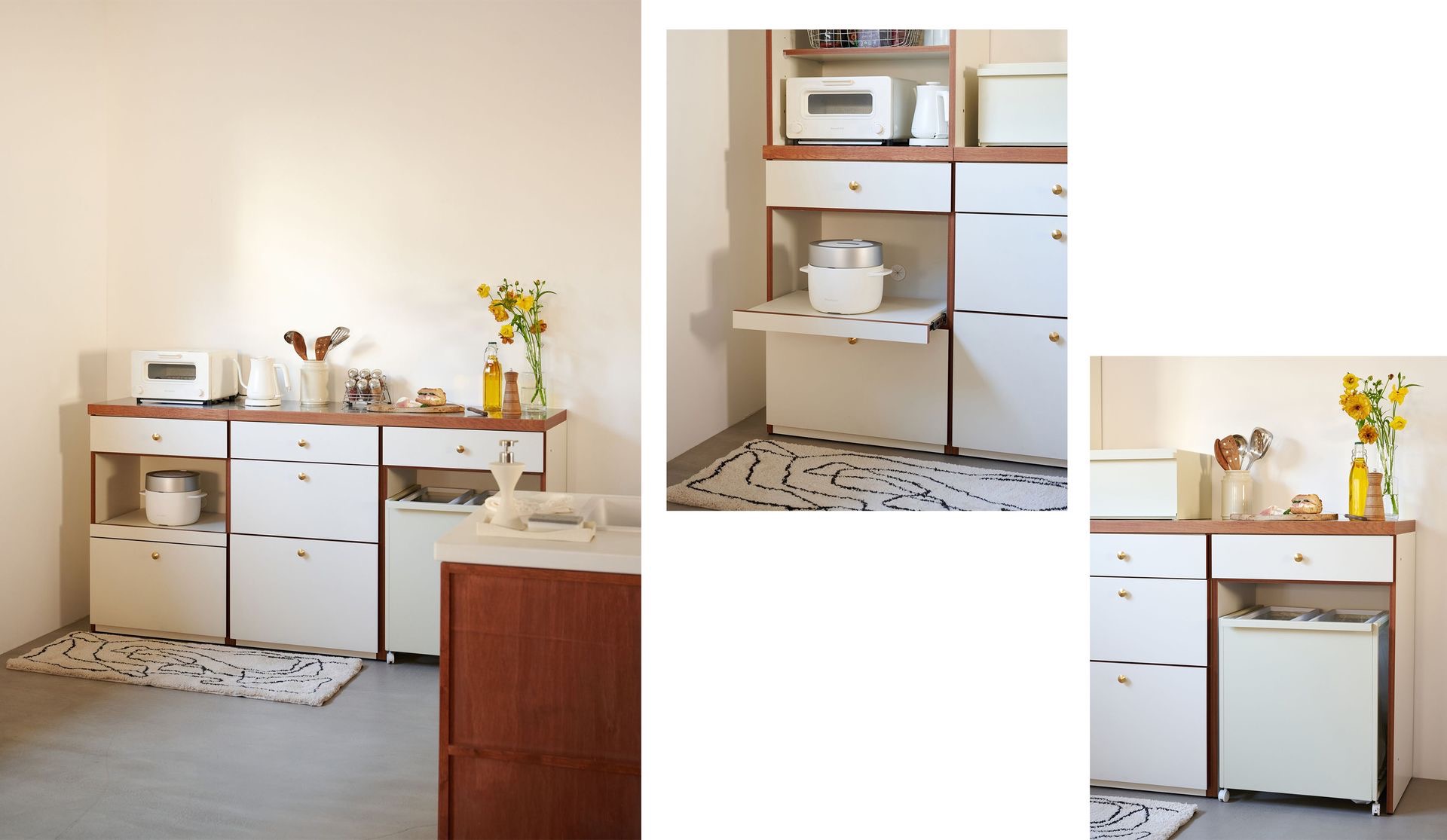 スライド式で家電が置きやすいスライドトレー、カトラリーや小物をすっきり整理できる引き出し仕様のチェスト、ゴミ箱スペースを確保できるダストタイプを横並びに組み合わせれば、日々の作業動線が整った、使いやすいキッチンカウンターに。