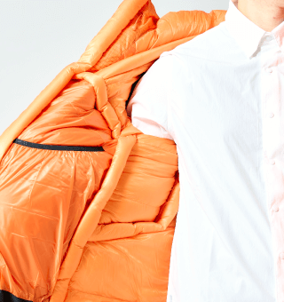 あたたかさの秘密は、「MAMMUT Wallバッフル構造」。パーカ内のダウンの偏りを低減して保温性を高めるだけでなく、ダウンが詰まったチューブを縫い合わせ部分に配置し外気を遮断。900フィルのホワイトグースダウンの保温性能を最大限に引き出している。