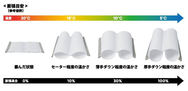 「ステルスシート」は気温が15度以下になると少しずつ膨らみ始め、5度以下になると円筒状に大きく膨らむのが特徴。内側に空気の層を作ることで保温性を高め、厚手のダウン並みのあたたかさを実現する。気温が高いときは薄くなるので、着膨れしないのも魅力。