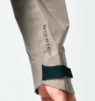 ジャケットの袖部分と、パンツの左サイドにはPERTEX®のリフレクターロゴを配置。車や自転車などのライトに反射して光るので、夜間や暗がりでの視認性を高めてくれる。